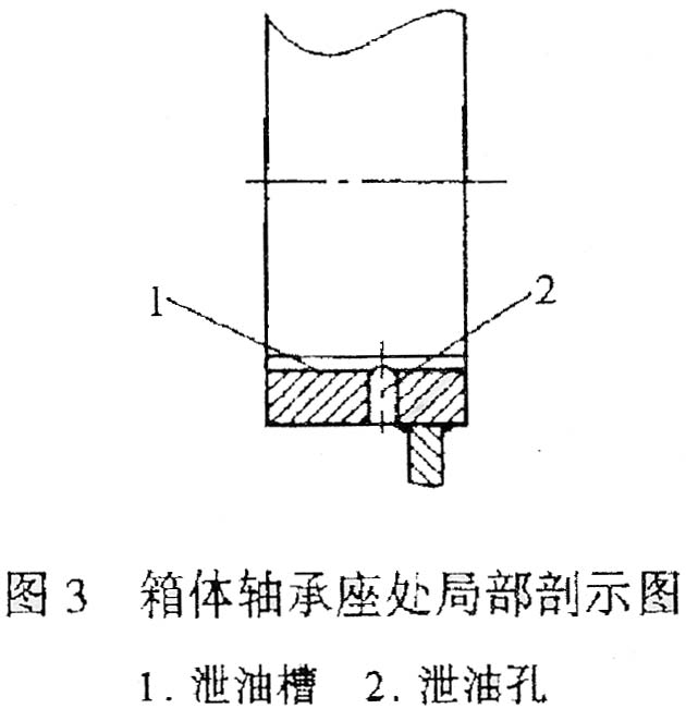 另外,在箱體的軸承座上開(kāi)有泄油槽和泄油孔,使被封住的油可以很快地流回箱體內(nèi)。其結(jié)構(gòu)如圖3所示。