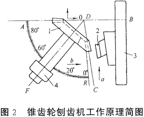 裝在機床搖臺3的滑枕上的刨齒刀2,除了可以按a向移動以外,還可以繞搖臺軸線OB轉(zhuǎn)動。齒坯一方面繞OF轉(zhuǎn)動,同時按箭頭b方向移動,使它的節(jié)錐中心O和機床中心D重合后即可進行加工。