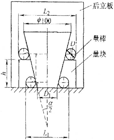 。2)將兩只量棒拿開(kāi),用兩塊高h(yuǎn)=60mm的長(zhǎng)方體量塊放在平臺(tái)上,且上端內(nèi)側(cè)與被測(cè)錐軸緊貼,后端面頂住后立板。將兩只量棒分別放在兩量塊的大方,且內(nèi)側(cè)與被測(cè)圓錐軸緊貼,后端頂住后立板,測(cè)出L2=163.19mm。則所測(cè)錐軸的錐度為: