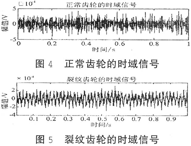 有限元仿真的正常齒輪的第10階固有頻率為708.17Hz,由采樣定理,取采樣頻率為2048Hz就可以了,采樣點(diǎn)數(shù)取為2048,輸入軸齒輪齒數(shù)z1=20,輸出軸齒輪齒數(shù)z2=30,輸入軸的回轉(zhuǎn)頻率為ƒr1=18.55Hz,因此嚙合頻率ƒm=371Hz。圖4和圖5分別給出了正常齒輪和裂紋齒輪(裂紋深度為4mm)的振動(dòng)信號(hào)時(shí)域波形圖。