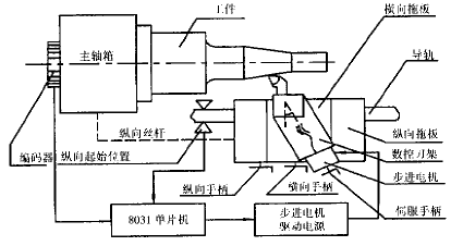 整個系統(tǒng)由數(shù)控刀架、Inter8031單片機、步進電機驅(qū)動電源、用于拾取主軸信號的編碼器以及檢測縱向起始信號的位置檢測元件再加上機床本體組成。系統(tǒng)改裝是在原普通車床的基礎上進行的,整個改裝工作量并不大,只需作以下工作: