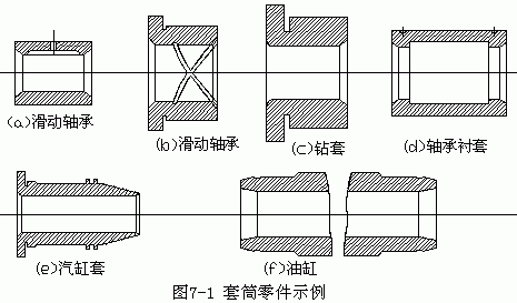套筒類零件是機(jī)械中常見的一種零件,它的應(yīng)用范圍很廣。如支承旋轉(zhuǎn)軸的各種形式的滑動軸承、夾具上引導(dǎo)刀具的導(dǎo)向套、內(nèi)燃機(jī)氣缸套、液壓系統(tǒng)中的液壓缸以及一般用途的套筒,如圖 7 - 1 所示。由于其功用不同,套筒類零件的結(jié)構(gòu)和尺寸有著很大的差別,但其結(jié)構(gòu)上仍有共同點,即:零件的主要表面為同軸度要求較高的內(nèi)外圓表面;零件壁的厚度較薄且易變形;零件長度一般大于直徑等。