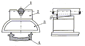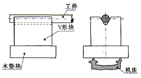 粗車時(shí),可采用如圖1所示的支架,支架由V形塊和木墊塊組成,木墊塊壓在機(jī)床導(dǎo)軌上。半精車、精車時(shí)可采用如圖2所示的托架,托架是在加工過程中起減振作用的主要輔具,托架由兩塊制有3°斜面的木質(zhì)(紅松)托塊組成,上托塊的上面制成V型托口,這可使工件與上托塊在互相作用時(shí)能夠形成不完全碰撞,受力時(shí)一部分功能將受到損失,以達(dá)到減小反作用力的目的。根據(jù)實(shí)踐經(jīng)驗(yàn),V型夾角a=30°~50°為宜,輔具安放數(shù)量視工件長徑比及工件長度而定,當(dāng)長徑比大于80、工件長大于1500mm以上時(shí),每隔600~800mm放置一個(gè)。
