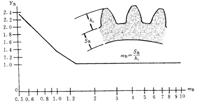 在薄輪緣齒輪根應(yīng)力基本值計(jì)算時(shí),應(yīng)增加一項(xiàng)輪緣系數(shù)YB,用以考慮輪緣齒高比mB對(duì)齒根彎曲應(yīng)力的影響。即對(duì)用方法一[見(jiàn)4.2.2a]計(jì)算σF0時(shí),本標(biāo)準(zhǔn)中式(12)應(yīng)改寫(xiě)成