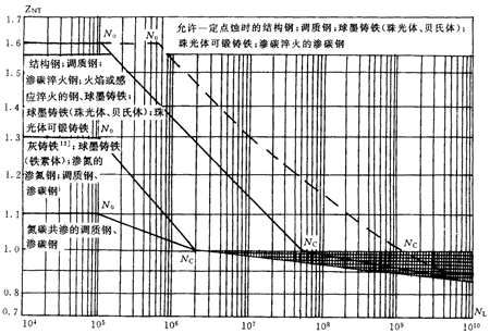 條件循環(huán)次數(shù)Nc是齒輪材料S-N(即應(yīng)力-循環(huán)次數(shù))曲線上一個(gè)特征拐點(diǎn)的循環(huán)次數(shù),并取該點(diǎn)處的壽命系數(shù)為1.0,相應(yīng)的S-N曲線上的應(yīng)力稱為疲勞極限應(yīng)力。