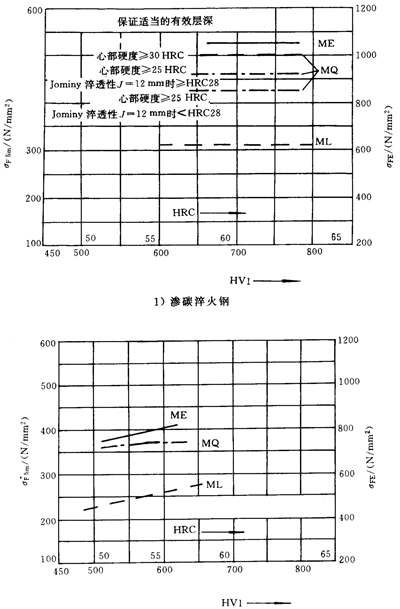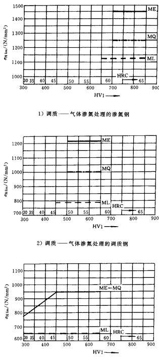 在σHlim和σFlim的圖中,給出了代表材料質(zhì)量等級(jí)的三條線,其對(duì)應(yīng)的材料處理要求見(jiàn)GB8539。