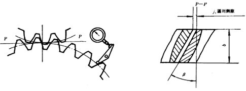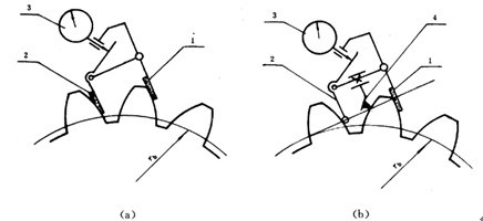 單點(diǎn)法測量法向側(cè)隙的原理參見圖45。單點(diǎn)測量法向側(cè)隙時(shí):在中心距和使用時(shí)中心距相同的情況下,可用測片或塞片進(jìn)行測量。也可和測量圓周側(cè)隙相似使用百分表,但要將百分表測頭放置在與齒面垂直的方向上,此時(shí)從百分表上讀出的晃動(dòng)量即為法向側(cè)隙值。