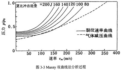 雙曲線法的具體分析過(guò)程如圖3-3所示,坐標(biāo)橫軸表示速度,縱軸表示氣體壓力或環(huán)向應(yīng)力。上方的一組曲線表征不同韌性水平下的斷裂速度,是內(nèi)壓或環(huán)向應(yīng)力的函數(shù)。隨著內(nèi)壓或環(huán)向應(yīng)力在斷裂過(guò)程中的減小,斷裂速度不斷降低。如果壓力或應(yīng)力足夠低,斷裂速度即減小到零而發(fā)生止裂。
