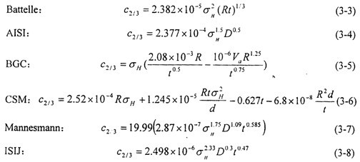 在雙曲線法的基礎(chǔ)上,結(jié)合大量的實(shí)驗(yàn)結(jié)果對(duì)止裂韌性進(jìn)行標(biāo)定,世界各大研究機(jī)構(gòu)分別給出了簡(jiǎn)便易算的經(jīng)驗(yàn)公式用以估算臨界止裂韌性,列舉如下: