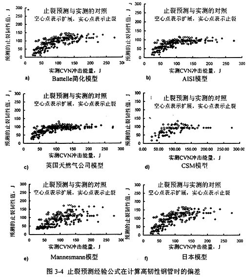 圖3-4表示了Battelle應(yīng)用Maxey雙曲線法對(duì)全尺寸實(shí)驗(yàn)數(shù)據(jù)庫(kù)所做的DDF止裂韌性預(yù)測(cè),圖3-4a至圖3-4f分別對(duì)應(yīng)于式(3-3)至式(3-8)。圖中顯示的實(shí)驗(yàn)用管的鋼級(jí)包括X52到Xl00,管徑范圍從4O6mm到1422mm,實(shí)驗(yàn)最高壓力超過(guò)16MPa?梢(jiàn),預(yù)測(cè)模型在管材韌性低于某一水平時(shí)預(yù)測(cè)結(jié)果與實(shí)物實(shí)驗(yàn)結(jié)果基本吻合,但當(dāng)管材韌性較高時(shí)出現(xiàn)明顯偏差,預(yù)測(cè)應(yīng)該止裂的管線沒(méi)有止裂。經(jīng)典的止裂預(yù)測(cè)模型在預(yù)測(cè)夏比能量值高于94J的管材時(shí),已經(jīng)偏于危險(xiǎn),即過(guò)高估計(jì)了管材的止裂性能。