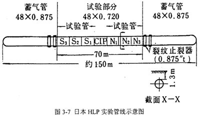 為了清楚地闡述在國(guó)外高韌性輸氣鋼管的全尺寸爆破實(shí)驗(yàn)中觀測(cè)到的由材料韌性引起的裂紋持續(xù)減速現(xiàn)象,有必要先對(duì)全尺寸實(shí)驗(yàn)的方法作較為細(xì)致的描述。本節(jié)的數(shù)據(jù)還會(huì)用作第四章小試樣實(shí)驗(yàn)和本章的韌性減速計(jì)算的比較。