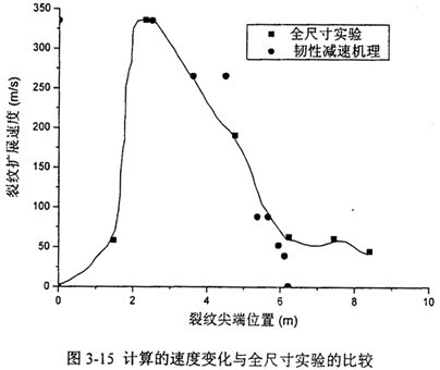 本文通過(guò)上述方法,對(duì)圖3-9至圖3-12中的全尺寸實(shí)測(cè)斷裂速度曲線結(jié)果進(jìn)行了校核,得到了比較吻合的結(jié)果,F(xiàn)以聯(lián)盟管道第一次實(shí)驗(yàn)IE段為例,設(shè)定擴(kuò)展的初速度為330m/s,速度變化的計(jì)算值同實(shí)驗(yàn)對(duì)比如圖3-15所示: