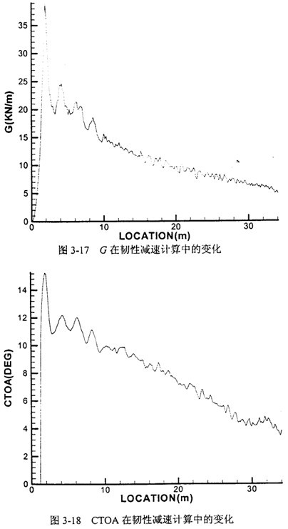 圖3-17和圖3-18是針對(duì)西氣東輸某特定設(shè)計(jì)參數(shù)的管線,應(yīng)用韌性減速機(jī)理計(jì)算時(shí)能量釋放率G和裂紋尖端張開(kāi)角CTOA的變化。