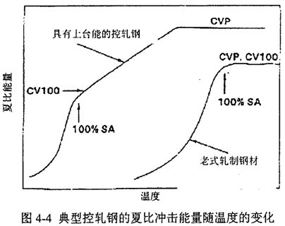 對(duì)于斷口上有分離的材料,隨溫度的升高,分離將最終消失,這是因?yàn)轳R氏體和貝氏體帶也達(dá)到了上平臺(tái)溫度。圖4-4表示典型控軋鋼的夏比能量隨溫度的變化。夏比沖擊試樣上100%剪切面積對(duì)應(yīng)的最小夏比能稱為CV100。當(dāng)所有的分離都消失時(shí),上平臺(tái)能CVP出現(xiàn),其大小可能高于CV100。
