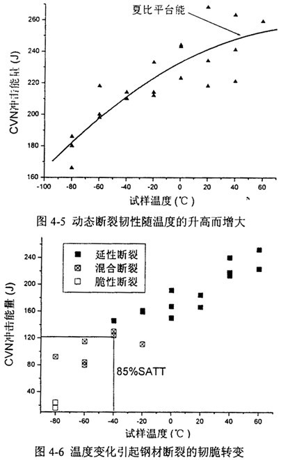 表4-3給出了歸納的夏比沖擊能量值及85%剪切面積對(duì)應(yīng)的轉(zhuǎn)變溫度。