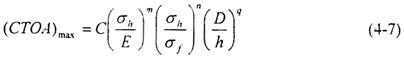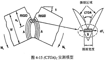 (CTOA)c可以通過攝像機(jī)從實(shí)物裂紋擴(kuò)展的照片上觀測(cè)得到,也可同CVN或DWTT實(shí)驗(yàn)建立聯(lián)系。Wilkowski分別建立了基于CVN和DWTT吸收功的(CTOA)c經(jīng)驗(yàn)算法,模型如圖4-15。另一種方法是通過測(cè)定作用于試件上的總功,從裂紋擴(kuò)展能的角度計(jì)算(CTOA)c。