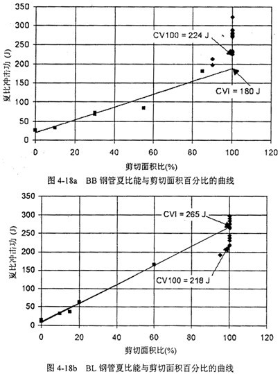 圖4-18a,b,c給出了三家鋼管的夏比能與剪切面積的關(guān)系,以及85%剪切面積對(duì)應(yīng)的轉(zhuǎn)變溫度。圖中CV100表示100%剪切面積時(shí)最低的夏比能,CVI表示最低夏比平臺(tái)能,也稱夏比轉(zhuǎn)變能,CVP表示夏比平臺(tái)能。菱形實(shí)驗(yàn)點(diǎn)表示剪切面積高于90%,方形實(shí)驗(yàn)點(diǎn)表示低于90%可以看到,剪切面積低于90%時(shí),夏比能與剪切面積呈線性關(guān)系。