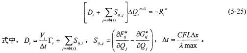 方程(5-24)可以采用顯式或隱式的方法進(jìn)行求解。但是由于受時(shí)間步長(zhǎng)的限制,采用顯式的R-K時(shí)間推進(jìn)方法需要迭代的步數(shù)較多,計(jì)算很不經(jīng)濟(jì),因此本文采用了Gauss-Seidel迭代隱式求解的方法。