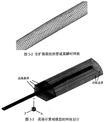 圖5-3是以圖5-2為依據(jù)建立的流場(chǎng)計(jì)算網(wǎng)格。設(shè)計(jì)參數(shù)為:裂紋擴(kuò)展速度200m/s,管道外徑1016mm,壁厚14.7mm,內(nèi)壓10MPa。