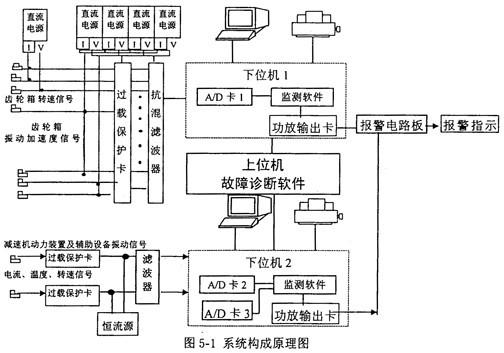 為完成對關(guān)鍵設(shè)備進(jìn)行監(jiān)測和診斷,監(jiān)測系統(tǒng)硬件的配置應(yīng)包括以下六部分:(l)傳感器、放大器;(2)信號處理儀;(3)A/D數(shù)據(jù)采集卡;(4)工業(yè)PC計算機;(5)報警電路;(6)電纜、電源。