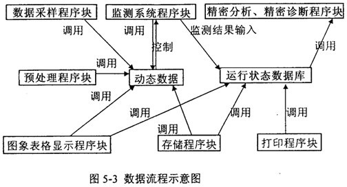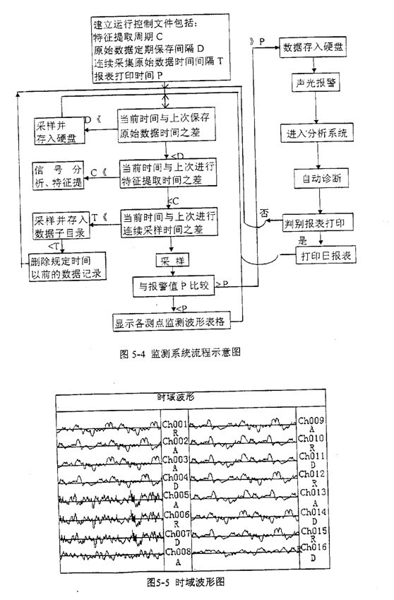軟件的各個模塊通過動態(tài)數(shù)據(jù)和運行狀態(tài)數(shù)據(jù)庫聯(lián)系在一起,在下位機中,監(jiān)測系統(tǒng)控制著動態(tài)數(shù)據(jù)的采集、存儲、顯示和預(yù)處理,同時把監(jiān)測結(jié)果存入各機組運行狀態(tài)特征數(shù)據(jù)庫。在上位機中,詳細(xì)分析診斷程序塊調(diào)用運行狀態(tài)數(shù)據(jù)庫,得出診斷結(jié)果并調(diào)用打印程序塊輸出。圖5-3為數(shù)據(jù)流程示意圖,圖5-4為監(jiān)測系統(tǒng)流程示意圖。