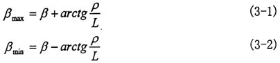 由于在轉(zhuǎn)動的過程中,三叉桿交點作旋轉(zhuǎn)運動,因此會導(dǎo)致輸入軸與輸出軸之間的夾角發(fā)生變化,其變化范圍為βmin~βmax,當(dāng)O點(見圖3-5)處于輸入軸與輸出軸轉(zhuǎn)動錐中心線所構(gòu)成平面的兩個極限位置時,偏轉(zhuǎn)角達到兩極值: