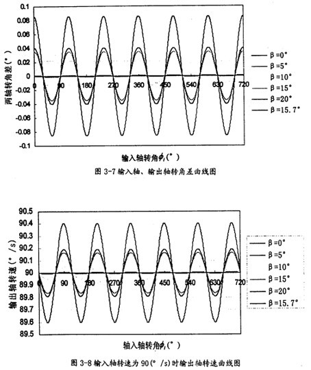 由曲線圖3-7可以看出兩軸的轉(zhuǎn)角差相當(dāng)小,即使在兩軸夾角達到2oo時,輸入同輸出的最大轉(zhuǎn)角差也不到o.1o,所以在一定的程度上認(rèn)為輸入、輸出轉(zhuǎn)角相同是有一定的道理的。且轉(zhuǎn)角隨兩軸夾角β的增大而增大,變化的頻率為一個回轉(zhuǎn)周期3次。