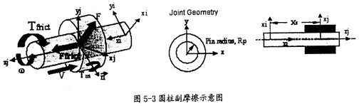 圓柱副產(chǎn)生摩擦的示意圖5-3所示。在這種動動副中會產(chǎn)生逆向于移動方V(如圖5-3中藍色箭頭所示)的摩擦力Ffrict(如圖5-3中紅色箭頭所示)及逆向于旋轉(zhuǎn)方向ω(如圖5-3中藍色箭頭所示)的摩擦扭矩Ffrict(如圖5-3中紅色箭頭所示),它的產(chǎn)生主要由兩種因素,即構件間相互作用的徑向力F、構件間相互作用的彎矩Tm(這兩種力如圖5-3中綠色箭頭所示)。在施加這些作用力產(chǎn)生的摩擦力時,要考慮徑向力F的大小、圓柱半徑RP(如圖5-3中間圖所示)、運動副間的重疊量和重疊量的變化情況、彎矩Tm的大小和彎矩的反作用臂長Xs(如圖5-2中右圖所示),另外還得考慮靜摩擦系數(shù)、動摩擦系數(shù)及預載荷的作用。