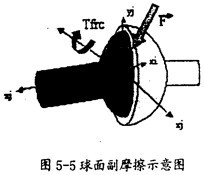 球面副產(chǎn)生摩擦的示意圖如圖5-5所示。在這種運動副中只會產(chǎn)生逆向于旋轉(zhuǎn)方向的摩擦扭矩Tfrc(如圖5-5中紅色箭頭所示),它的產(chǎn)生只有一種因素,即構件間相互作用的徑向力F(如圖5-5中灰色箭頭所示)。在施加由相互作用的徑向力F產(chǎn)生的摩擦力時,要考慮徑向力F的大小和球半徑,另外還得考慮靜摩擦系數(shù)、動摩擦索數(shù)及預載荷的作用。