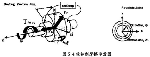 旋轉(zhuǎn)副產(chǎn)生摩擦的示意圖如圖5-4所示。在這種運動副中只會產(chǎn)生逆向于旋轉(zhuǎn)方向。(如圖5-4中藍色箭頭所示)的摩擦扭矩Tfrict(如圖5-4中紅色箭頭所示),它的產(chǎn)生主要由三種因素,即構件間相互作用的徑向力Fr、構件間相互作用的軸向力Fa、構件間相互作用的彎矩Tr(這三種力如圖5-4中綠色箭頭所示)。在施加由這些作用力產(chǎn)生的摩擦力時,要考慮徑向力Fr的大小、圓柱半徑RP(如圖5-4右圖所示)、軸向力Fa的大小、摩擦半徑Rn的大。ㄈ鐖D5-4右圖所示)、彎矩Tm的大小和彎矩的反作用臂長(即旋轉(zhuǎn)副的長度,如圖5-4中左圖所示),另外還得考慮靜摩擦系、動摩擦系數(shù)及預載荷的作用。