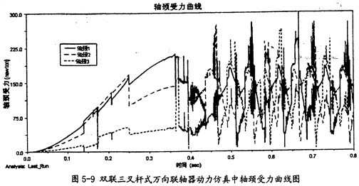 由圖5-9可以看出,雙聯(lián)三叉桿式萬向聯(lián)軸器在動力仿真的過程中, 雙聯(lián)三叉桿一端的三軸頸同內(nèi)球頭的圓柱副上的作用力變化趨勢同圖5-8中的小桿變化趨勢是相同的。由于它們的受力變動復雜,故這三力在雙聯(lián)三叉桿一端上的向量和也可能不為0。這樣在雙聯(lián)三叉桿上也會產(chǎn)生附加彎矩的作用。而且軸頸受力平均較小桿的受力要大。