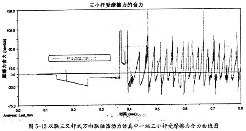 由圖5-11可以看出,雙取三叉桿式萬向聯(lián)軸器在動力仿真的過程中,其一端的三內(nèi)球頭同軸頸間的摩擦力變化相當有規(guī)律。當內(nèi)球頭相對軸頸運動反向時,綜們就會在正負間有規(guī)律的切換。但在這里產(chǎn)生摩擦力的平均大小要較小桿上的小得多。