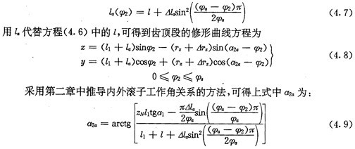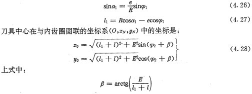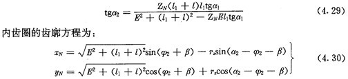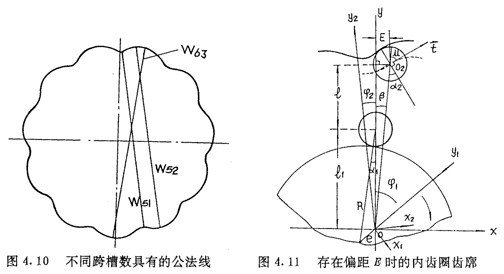 若令(4.30)式和(4.31)式中的E=0,得到的就是無偏距時的內(nèi)齒圈齒廓理論方程式(2.21)及公法線長度(4.18)式。