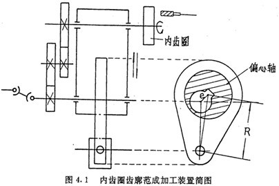 目前,在推桿減速器的批量生產(chǎn)中,其內(nèi)齒圈齒廓的加工采用的都是范成加工方法,加工的夾具及刀具的相對運動完全模擬減速器的運動。激波器的偏心距e由一個偏心軸的偏心距e來實現(xiàn),激波器的半徑Tb與內(nèi)滾子半徑Tz之和由偏心軸的幾何中心至固定點的距離R來實現(xiàn),傳動比由掛輪的傳動比來實現(xiàn),如圖4.1所示。