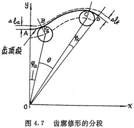 分段修形法是為了達到較理想的修形狀態(tài)而提出的一種能夠在數(shù)控加工中實現(xiàn)的齒廓修形方法。它根據(jù)修形后要達到的目標,將齒廓分成三段,如圖4.7所示,在工作段BC內(nèi)只進行微量的等距修形,在齒頂段AB及齒根段CD內(nèi)同時進行等距△Tz和移距△l增量函數(shù)修形。