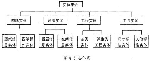 在面向?qū)ο蟮?SPAN lang=EN-US>CAD集成開(kāi)發(fā)系統(tǒng)里,系統(tǒng)數(shù)據(jù)模型的基本元素就是ARX開(kāi)發(fā)語(yǔ)言中的(多是C/C++語(yǔ)言)類,類實(shí)例化后稱為對(duì)象或?qū)嶓w,整個(gè)圖紙就是一個(gè)實(shí)體集合,主要由四大塊組成:圖紙實(shí)體集合、通用實(shí)體集合、工程實(shí)體集合和工程實(shí)體集合。其中,圖紙實(shí)體、通用實(shí)體和工具實(shí)體都為獨(dú)立類,沒(méi)有父類或子類;而工程實(shí)體集合中的各工程實(shí)體是由具有基本特征的基類實(shí)體派生而來(lái),具有一個(gè)基類和若干個(gè)派生類,并且各實(shí)體集之間互相獨(dú)立(如圖4-3所示)