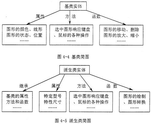 在上面所說(shuō)的四種實(shí)體里,圖紙實(shí)體、通用實(shí)體、工具實(shí)體都是一些簡(jiǎn)單實(shí)體,基本上是對(duì)一些AutoCAD的操作命令進(jìn)行集成,使之能夠?qū)こ虒?shí)體進(jìn)行操作,并且符合不同行業(yè)的命名規(guī)則。而最復(fù)雜的是工程實(shí)體,首先,每個(gè)行業(yè)中工程實(shí)體的種類繁多,必須進(jìn)行細(xì)致有序的分類,使之符合行業(yè)習(xí)慣;其次,確定基類與派生類之間的關(guān)系,有效地定義基類的各個(gè)屬性、方法和函數(shù),便于擴(kuò)充派生類;最后,要完整的定義每一個(gè)工程實(shí)體的所有的屬性、方法和函數(shù),特別重要的是,要很好地利用AutoCAD已提供的所有信息資源。對(duì)于以上的問(wèn)題,第一,要對(duì)行業(yè)的需求十分清晰,能夠?qū)π袠I(yè)中涉及到的工程實(shí)體進(jìn)行歸納,要具有“面向?qū)ο蟆钡木幊趟季S;第二,基類涉及的屬性方法和函數(shù)基本上與實(shí)體圖形的操作有密切關(guān)系(如圖4-4所示);派生類主要涉及到工程實(shí)體的特征屬性、特征方法和特征函數(shù)(如圖4-5示),完整地定義其基類和派生類是“面向?qū)ο蟮?SPAN lang=EN-US>CAD集成開(kāi)發(fā)系統(tǒng)”中的核心部分;第三,要充分的利用AutoCAD已提供的資源,主要就是要利用AutoCAD系統(tǒng)中的*,dwg文件的圖形文件數(shù)據(jù)庫(kù)中的資源,熟悉各種AutoCAD中實(shí)體(例如點(diǎn)、直線、圓弧等)的DXF碼規(guī)則,并從中提取相關(guān)特征信息;第四,由于在AutoCAD中的.dwg文件中,存儲(chǔ)的是一些簡(jiǎn)單的幾何的點(diǎn)、直線、圓、弧等信息,故還需要另一個(gè)文件去記錄整個(gè)圖紙的工程實(shí)體圖形的邏輯關(guān)系(下一節(jié)詳細(xì)介紹),隨同*.dwg文件的打開(kāi)而打開(kāi),標(biāo)識(shí)*.dwg文件圖形中的實(shí)體圖形邏輯關(guān)系,隨同*.dwg文件的關(guān)閉而記錄*.dwg文件中的實(shí)體圖菜邏輯關(guān)系。
