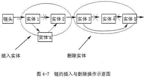 用戶對(duì)實(shí)體進(jìn)行查找、移動(dòng)、旋轉(zhuǎn)、刪除等操作,系統(tǒng)首先要在整個(gè)圖紙中搜索該實(shí)體,因而,系統(tǒng)必須對(duì)整個(gè)圖紙的實(shí)體的綜合信息進(jìn)行存儲(chǔ),多采用鏈?zhǔn)浇Y(jié)構(gòu),設(shè)置一個(gè)鏈頭和一個(gè)指向當(dāng)前實(shí)體的指針。采用鏈?zhǔn)浇Y(jié)構(gòu)的原因是它很方便進(jìn)行查找、插入、刪除,效率高,簡(jiǎn)單明了。(見(jiàn)圖4-7)