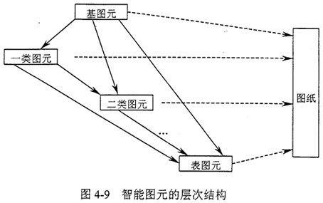 可繼承性:一個(gè)智能圖元不僅可以是其他智能圖元的父圖元,也可以是一個(gè)或多個(gè)智能圖元的子圖元,最底層的智能圖元稱為基圖元,他們沒(méi)有父圖元;最上層的智能圖元稱為表圖元,他們沒(méi)有子圖元,其集成度最高;就象一個(gè)機(jī)器的裝配圖由若干個(gè)零件圖組成,而一個(gè)零件圖是由若干個(gè)結(jié)構(gòu)單元組成,整個(gè)智能圖元集合屬于一種比較復(fù)雜的層次結(jié)構(gòu),如圖4-9。