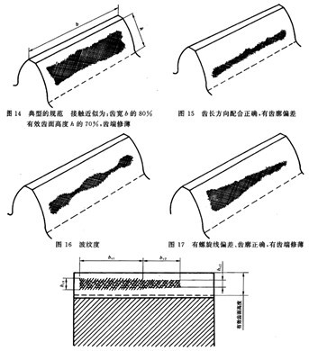 完成涂料涂刷后,操作者轉(zhuǎn)動小齒輪,使其涂有涂料的輪齒和大齒輪相嚙合,由助手在大齒輪上施加一個足夠反力矩以保證接觸,然后把齒輪反轉(zhuǎn)回到原來位置,在輪齒的背面做上記號,以便對接觸斑點進(jìn)行觀察。這個操作程序至少要在大齒輪三個等距離的位置上重復(fù)地做,以顯示由于擺動或其他周期性誤差所產(chǎn)生接觸斑點的變異。
