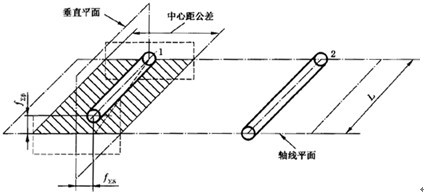 “軸線平面內(nèi)的偏差” f∑δ是在兩軸線公共平面上測(cè)量的,這公共平面是用兩軸承跨距中較長(zhǎng)的一個(gè)L和另一根軸上的一個(gè)軸承來確定的,如果兩個(gè)軸承的跨距相同,則用小齒輪軸和大齒輪軸的一個(gè)軸承。“垂直平面上的的偏差” f∑δ是在與軸線公共平面相相垂直的“交錯(cuò)軸平面”上測(cè)量的。
