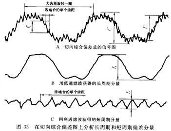重要的事是記住,在濾掉長周期分量后,一齒切向綜合偏差fi′(圖33A)實際上變小了,這樣真正的最大偏差fi′就未必能在經(jīng)濾波后的短同期分量的曲線(圖33C)中表示出來。