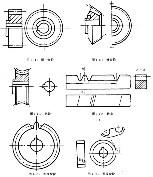③在剖視圖中,當(dāng)剖切平面通過齒輪的軸線時(shí),輪齒一律按不剖處理(圖1-111、1-112、1-113、1-114、1-117)。