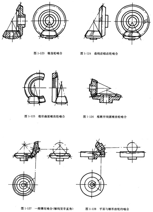 ③在圓柱齒輪嚙合、齒輪齒條嚙合和圓錐齒輪嚙合的剖視圖中,當(dāng)剖切平面通過兩嚙合齒輪的軸線時(shí),在嚙合區(qū)內(nèi),將一個(gè)齒輪的輪齒用粗實(shí)線繪制,另一個(gè)齒輪的輪齒被遮擋的部分用虛線繪制(圖1-119、1-1251、1-125、1-128);也可省略不畫(圖1-122、1-123、1-127)。