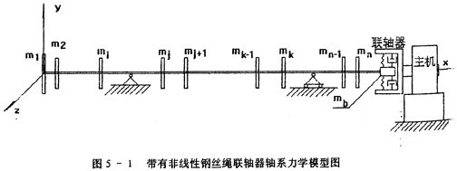 在第三章,根據(jù)試驗(yàn)的基礎(chǔ)建立了具有非線性遲滯特性聯(lián)袖器的恢復(fù)力模型。這一章,將研究一個(gè)帶有這種聯(lián)軸器的軸系如圖5-1所示,該軸系有n個(gè)圓盤(pán),由鋼絲繩聯(lián)軸器與主機(jī)相連接,按以下原則建立力學(xué)模型: