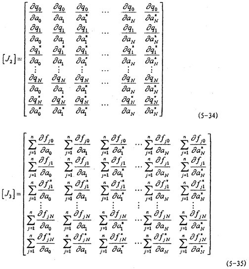 [J3]的計(jì)算實(shí)際上就是偏導(dǎo)數(shù) {fj({ a(k)})}/ { a(k)}的計(jì)算。計(jì)算方法與計(jì)算 {q({ a(k)})}的方法類(lèi)似,故不再贅述。對(duì)于[J2],[J3]、分別有式(5-34)、(5-35)。
