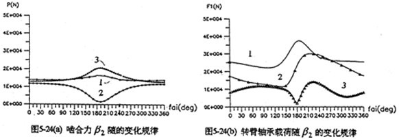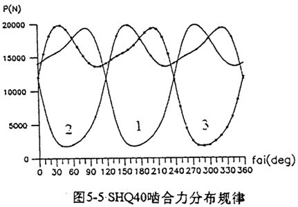 由表看出,各齒板過相同死點(diǎn)位置之不理時(shí)的嚙合力相等;某片齒板過死點(diǎn)位置時(shí),其它兩片齒板超前或者范后干該片嚙合120°與水平軸對稱。因此,這兩片的嚙合力相等,從圖5-4也反映了這一點(diǎn),這與實(shí)際情況相符合。