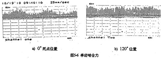 理想情況下,嚙合力的極小值在φ=0°、180°產(chǎn)生,極大值在φ=90°、270°產(chǎn)生,造成位置偏離的影響因素主要有軸承剛度,齒板剛度,嚙合角以及輸入轉(zhuǎn)速、傳動比等等。其中軸承剛度的影響極大。在死點(diǎn)的嚙合力也產(chǎn)不并一定為零。哈合力可能為負(fù)值。為負(fù)值時(shí),將阻礙傳動的正常轉(zhuǎn)動,產(chǎn)生內(nèi)齒輪副的干涉現(xiàn)象。并引起減速器沖擊振動。因此,按照嚙合力過死點(diǎn)時(shí)為零的假設(shè)分布規(guī)律以及嚙合力為常數(shù)分布規(guī)律的模型分析,所得結(jié)果都是不可靠的。圖5-6是齒板死點(diǎn)位置180°及另一齒板位于超前120°嚙合點(diǎn)的單齒嚙合圖的測試結(jié)果。圖中每一棒線代表被測齒受嚙合力作用一次。比較兩圖可知,死點(diǎn)位置嚙合力總體水平低于120°位置時(shí)的嚙合力總體水平,與理論分析計(jì)算的結(jié)果完全吻合。