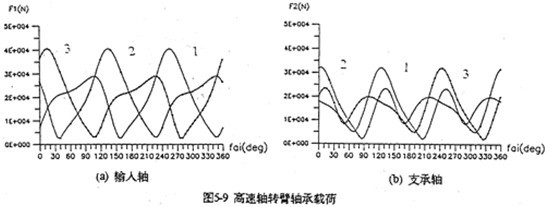 4.輸出軸的行星軸承總體載荷比支承軸行星軸承總體載荷大(圖5-9),特別是輸入軸X方向受力最大。輸入軸行星軸承載荷在死點(diǎn)附近取得最小值,在φ=105°、255°取得極大值。極大值產(chǎn)生的位置正好是機(jī)構(gòu)傳動角最佳位置附近。在同一時(shí)刻,齒板上各輸入軸行星軸承的受力狀況是不是一樣的。當(dāng)某一齒板接近其死點(diǎn)位置時(shí),軸承載荷較小,而同時(shí)另外兩片遠(yuǎn)離死點(diǎn)位置的齒板上輸入軸行星軸承載荷要大得多。支承軸的軸承載荷在一個(gè)周期內(nèi)分別出現(xiàn)三次極大值和三次極小的值。由于這個(gè)原因使支承軸偏心套的微動磨損比輸入軸偏心套的微動磨損更為嚴(yán)重。行星軸承載荷的最大值為