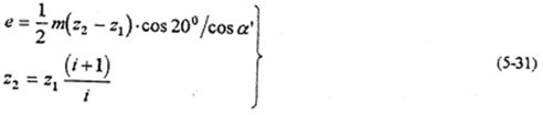 由上式知,當(dāng)齒數(shù)差Z2-Z1越小或傳動比i越大時(shí),偏心距e越小;壓力角越大時(shí),偏心距e越大,則選用的行星軸承尺寸大,齒板高速軸承孔徑也就大。圖5-17是傳動比、壓力角、以減速器行星軸承載荷的影響。由圖可見,傳動比的變化對減速器的動力性能影響極大;傳動比越大,則偏心距越小。由式(5-30)分析得,行星軸承載荷必須大。壓力角的變化,對行星軸承載荷影響小得多。